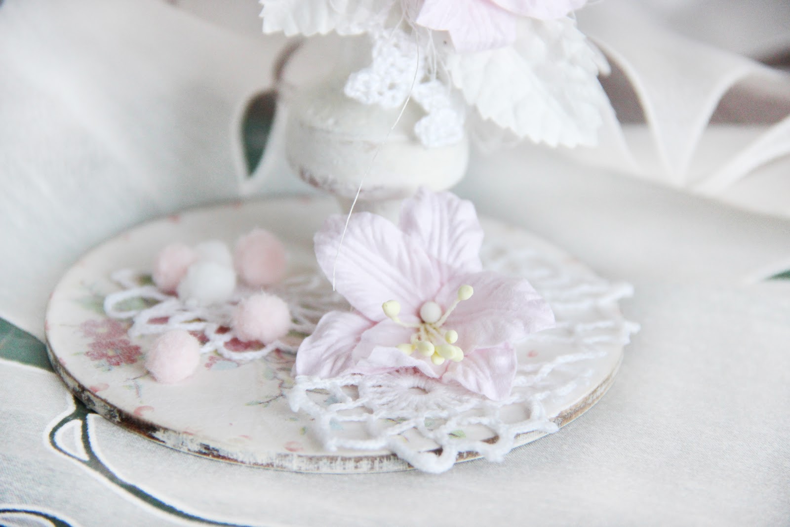 Выкрасила белым акрилом, Чуток декупажила их, потом снова акрил, потом лак, в работе цветы, рафия, сизаля немного, чуток марли, вязаное кружево и помпончики.